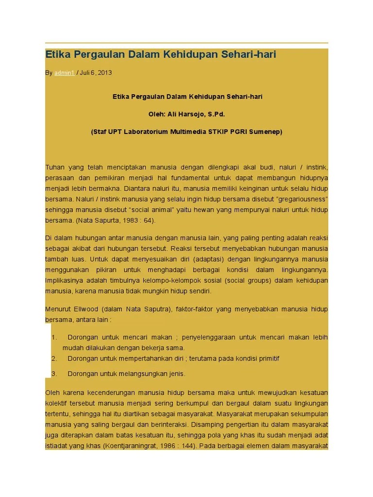Tentu hal itu harus dihentikan ya sobat, yakni dengan memberikan kesadaran dan menanamkan secara dini pentingnya memiliki etika dalam keseharian . Pengaruh negatif itu maksudnya, bahwa kelompok teman sebaya itu bisa menjadi racun bagi perkembangan remaja yaitu apabila pola perilaku para . Pengertian etika secara etimologi etika berasal dari bahasa yunani, yaitu ethos yang berarti watak . Etika berasal dari bahasa yunani kuno ethos dalam bentuk tunggal mempunyai banyak arti: Mengatakan "remaja adalah suatu usia dimana. Berkenaan dengan etika pergaulan yang sehat. Kenakalan remaja, pergaulan bebas, penggunaan narkoba, tawuran serta penggunaan etika yang salah dalam kehidupan. Mengenai penguatan etika pergaulan remaja yang akan dilakukan melalui kegiatan. Oleh karena itu, melalui pembinaan tata . Diskusi kelompok untuk meningkatkan pemahaman etika pergaulan siswa kelas vii. Peserta didik pada masa remaja biasanya memiliki. Keadilan senantiasa bersikap adil dalam bergaul. Bab ii etika pergaulan remaja dan buku a.